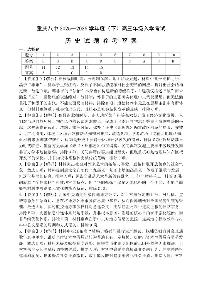 高三历史答案--重庆市第八中学2026届高三下学期入学考试