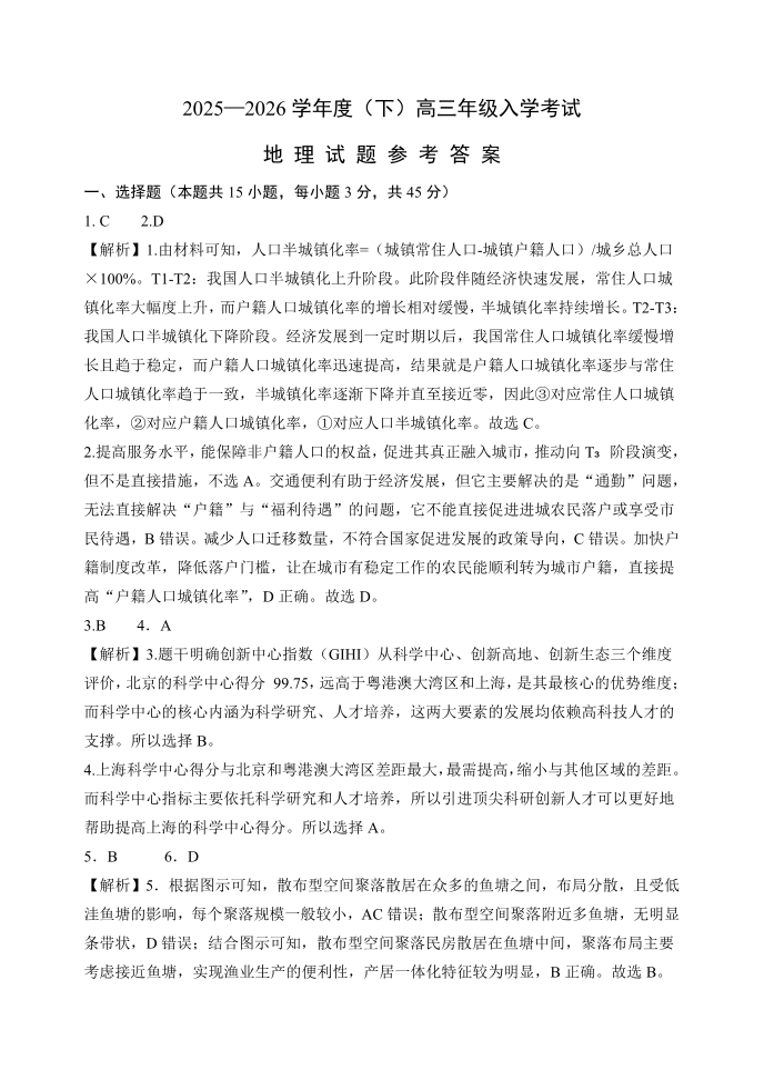 高三地理答案--重庆市第八中学2026届高三下学期入学考试