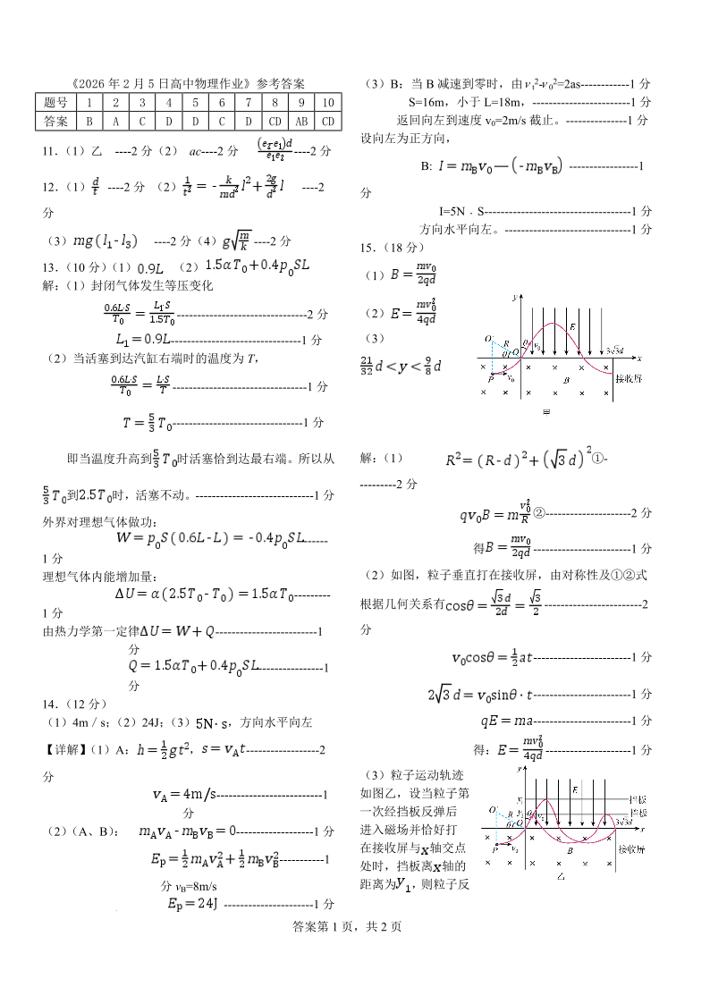 高三物理答案--黑龙江省哈尔滨市第一中学、第六中学2026届高三二月阶段性测试