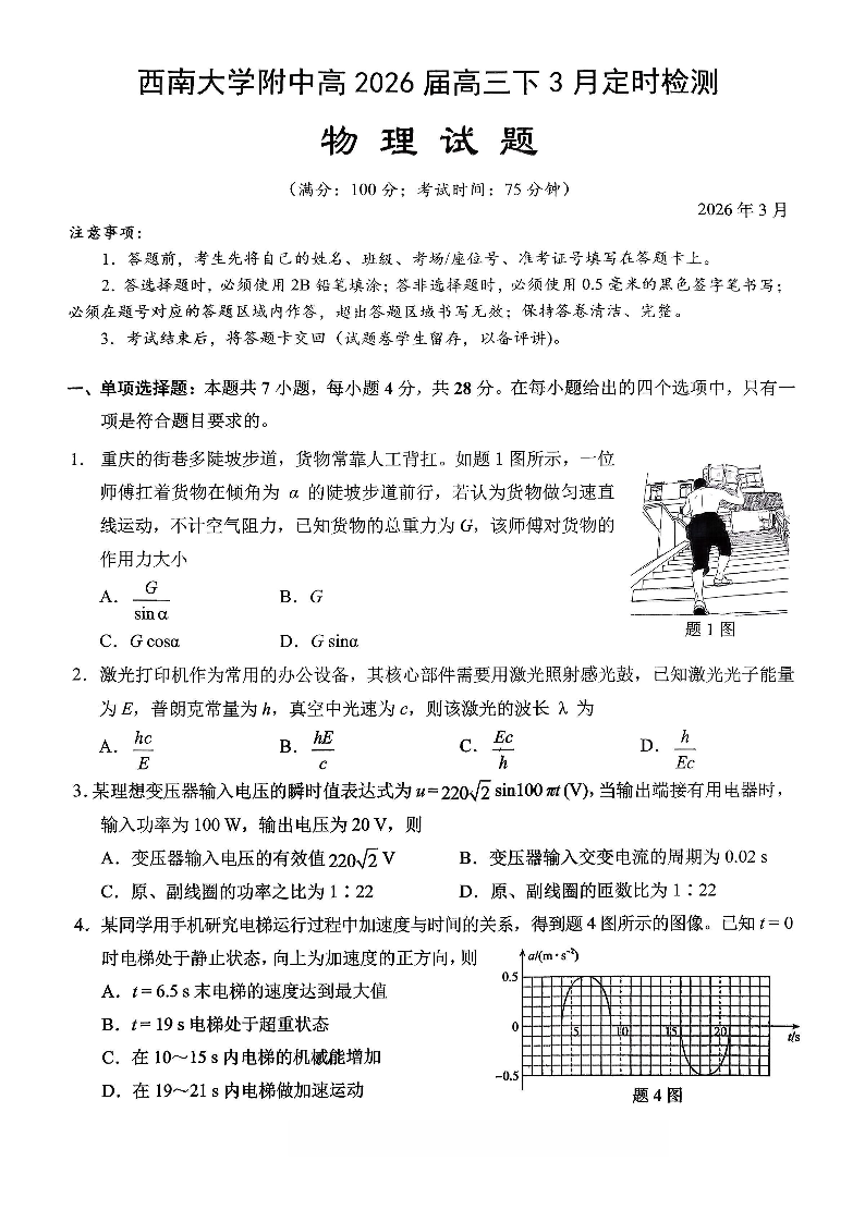 高三物理--重庆市西南大学附属中学2026届高三下学期3月入学考试