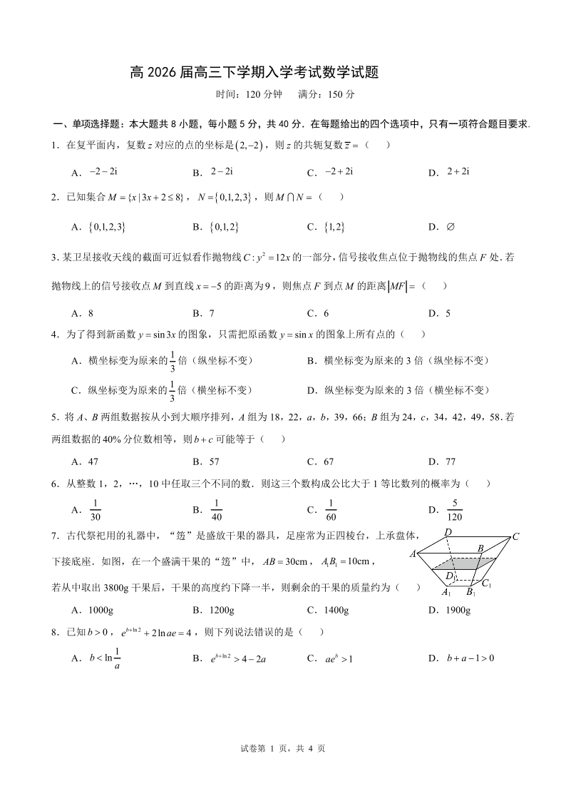 高三数学--四川省成都市第七中学2026届高三下期高开学考试