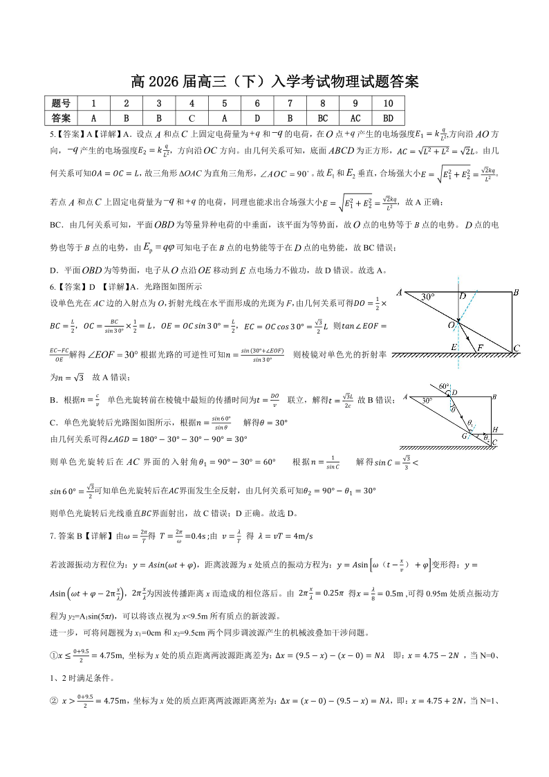 高三物理答案--重庆市育才中学2026届高三下学期入学考试
