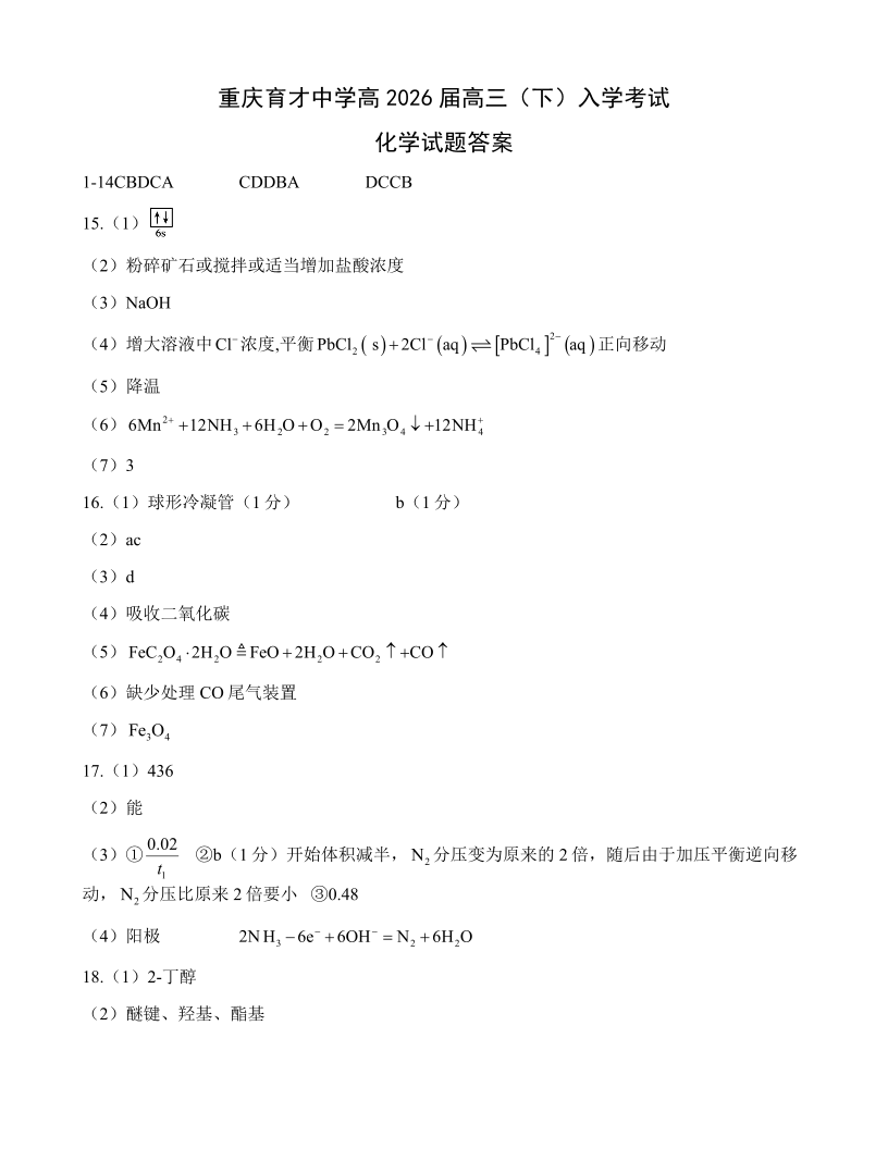 高三化学答案--重庆市育才中学2026届高三下学期入学考试