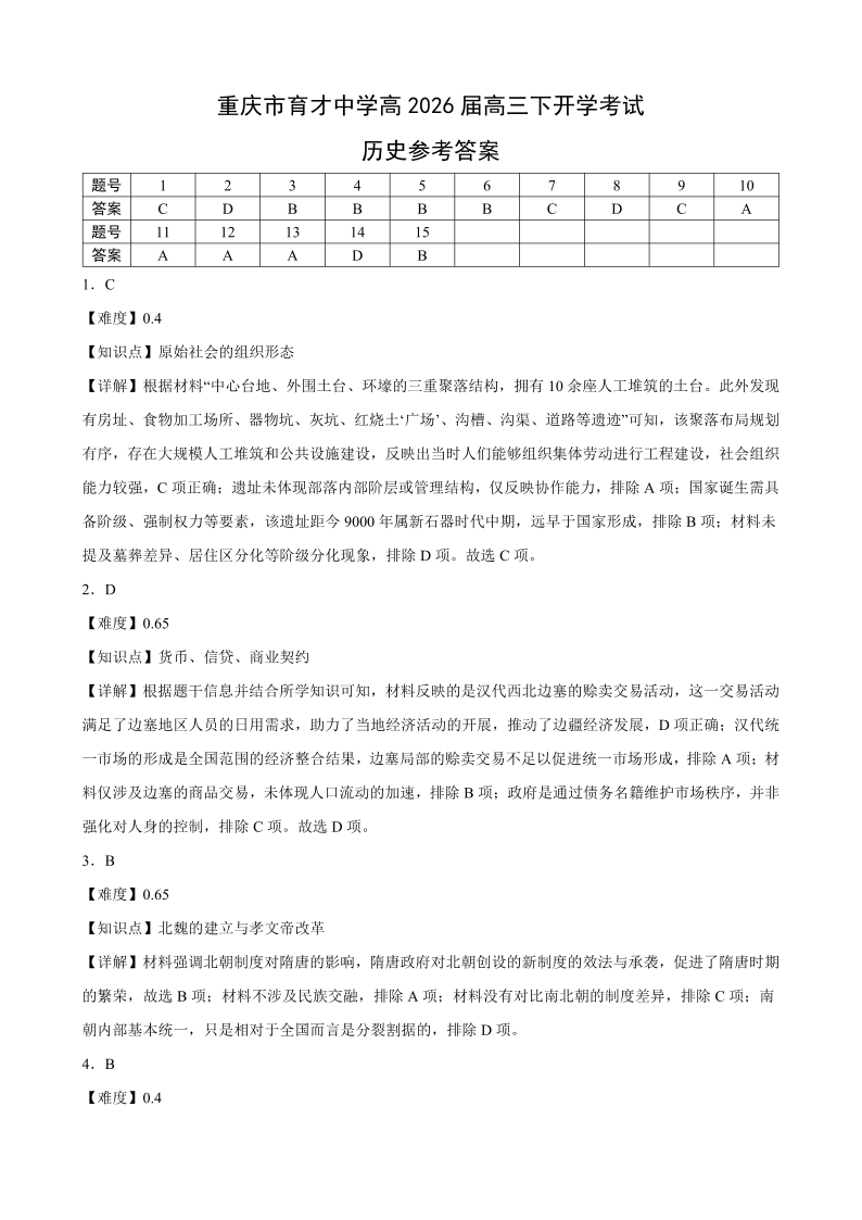 高三历史答案--重庆市育才中学2026届高三下学期入学考试