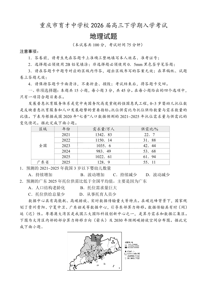 高三地理--重庆市育才中学2026届高三下学期入学考试