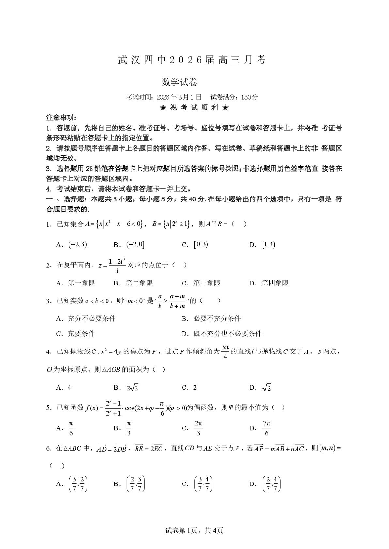高三数学--湖北武汉四中2026届高三下学期3月月考