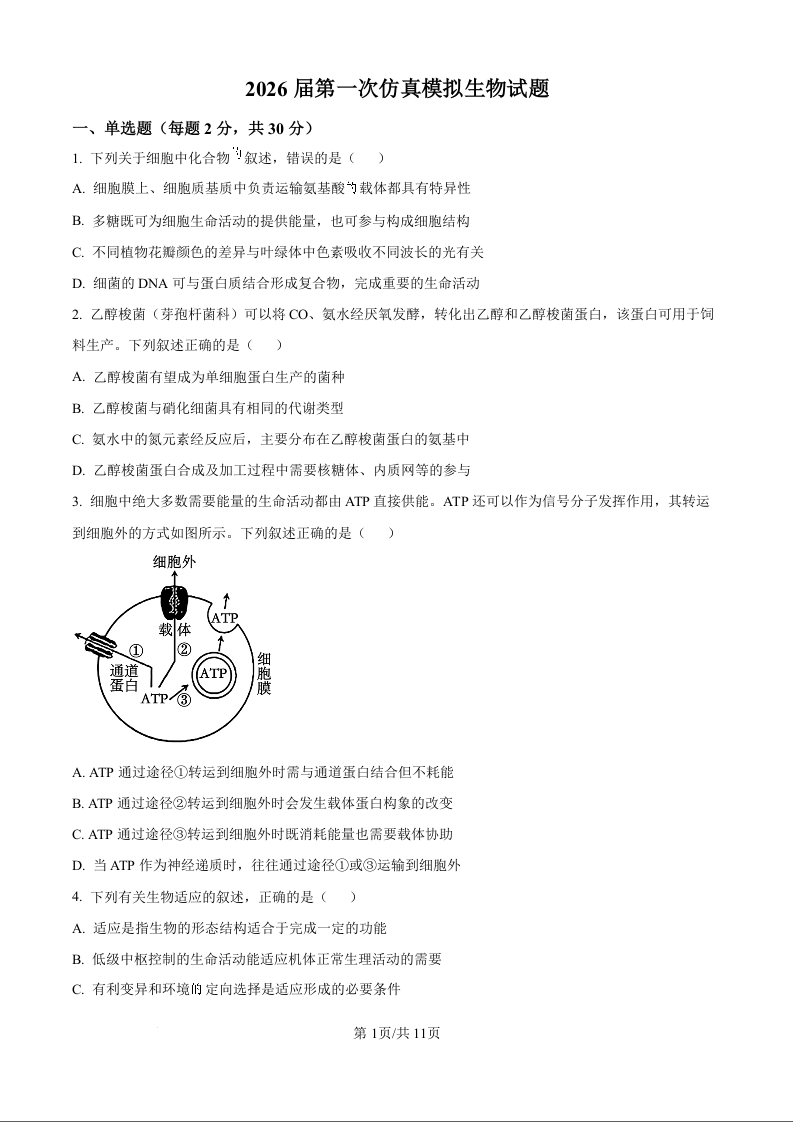 高三生物(原卷版)--江苏南京市六合区名校联盟2026届高三下学期第一次模拟考试