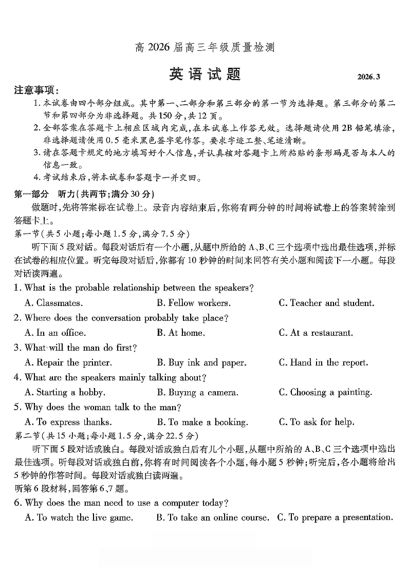 高三英语--重庆市南开中学2026届高三第六次质量检测