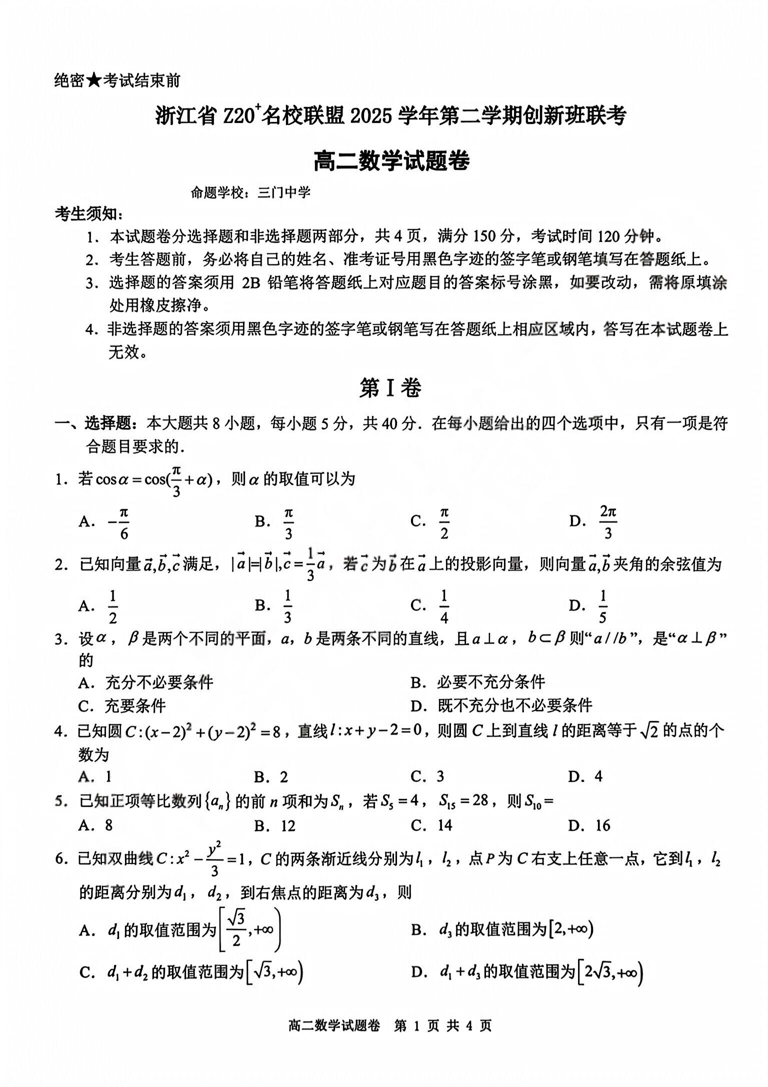 高二数学+答案--浙江省Z20名校联盟2025-2026学年高二创新班开学联考