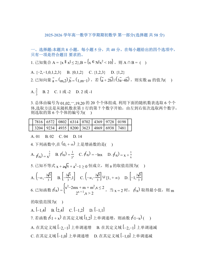 高一数学+答案--辽宁省实验中学2025-2026学年高一下学期2月期初考试