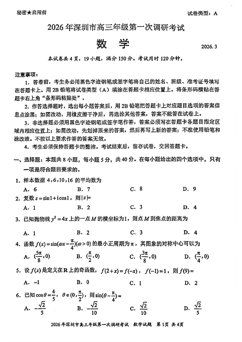 高三数学--广东省深圳市2026届高三第一次调研考试(深圳一模)