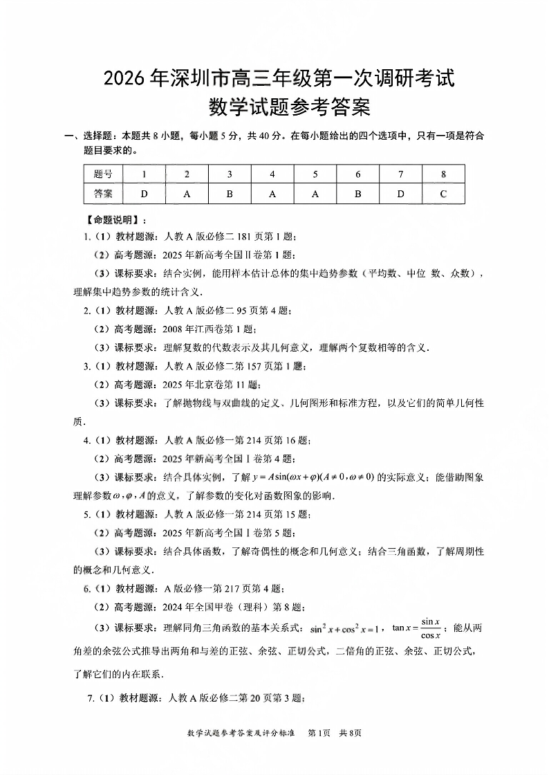 高三数学答案--广东省深圳市2026届高三第一次调研考试(深圳一模)