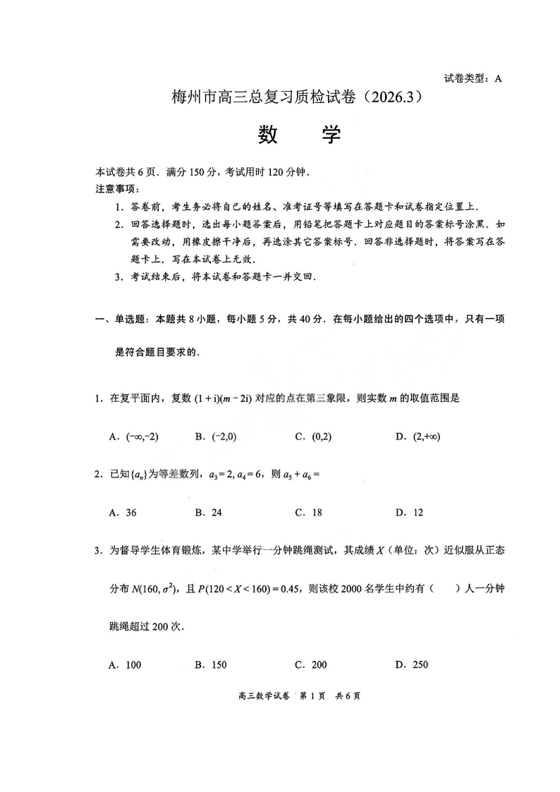 高三数学--广东梅州市2026届高三下学期3月总复习质检