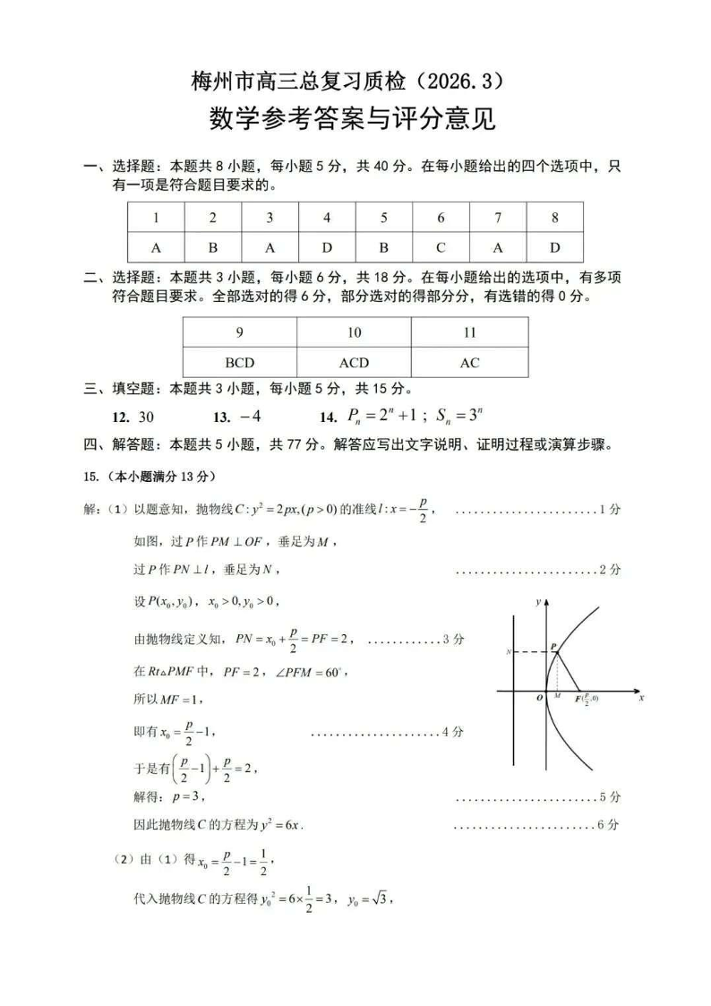 高三数学答案--广东梅州市2026届高三下学期3月总复习质检