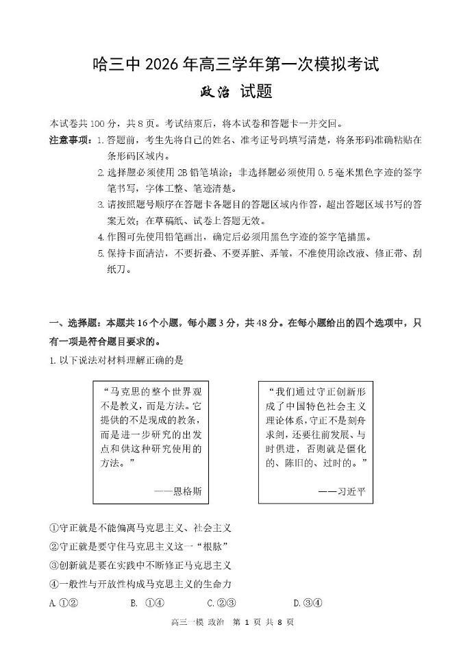 高三政治--黑龙江省哈尔滨市第三中学校2026届高三第一次模拟考试
