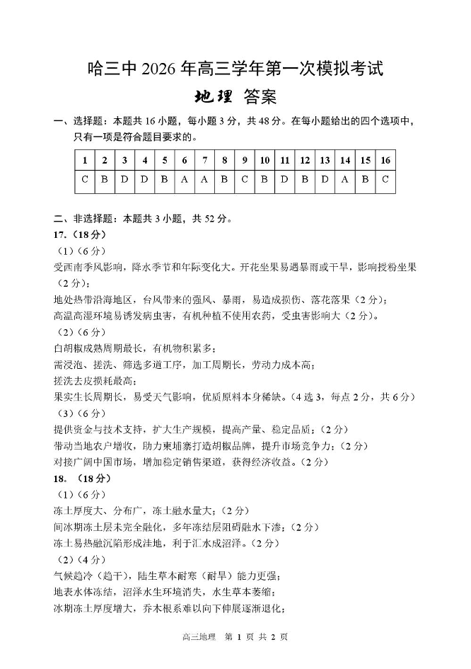 高三地理答案--黑龙江省哈尔滨市第三中学校2026届高三第一次模拟考试