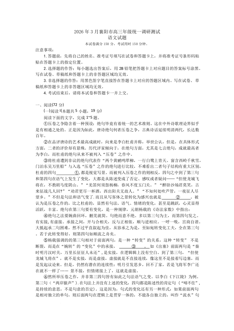 高三语文+答案--湖北襄阳市2026届高三3月统一调研测试