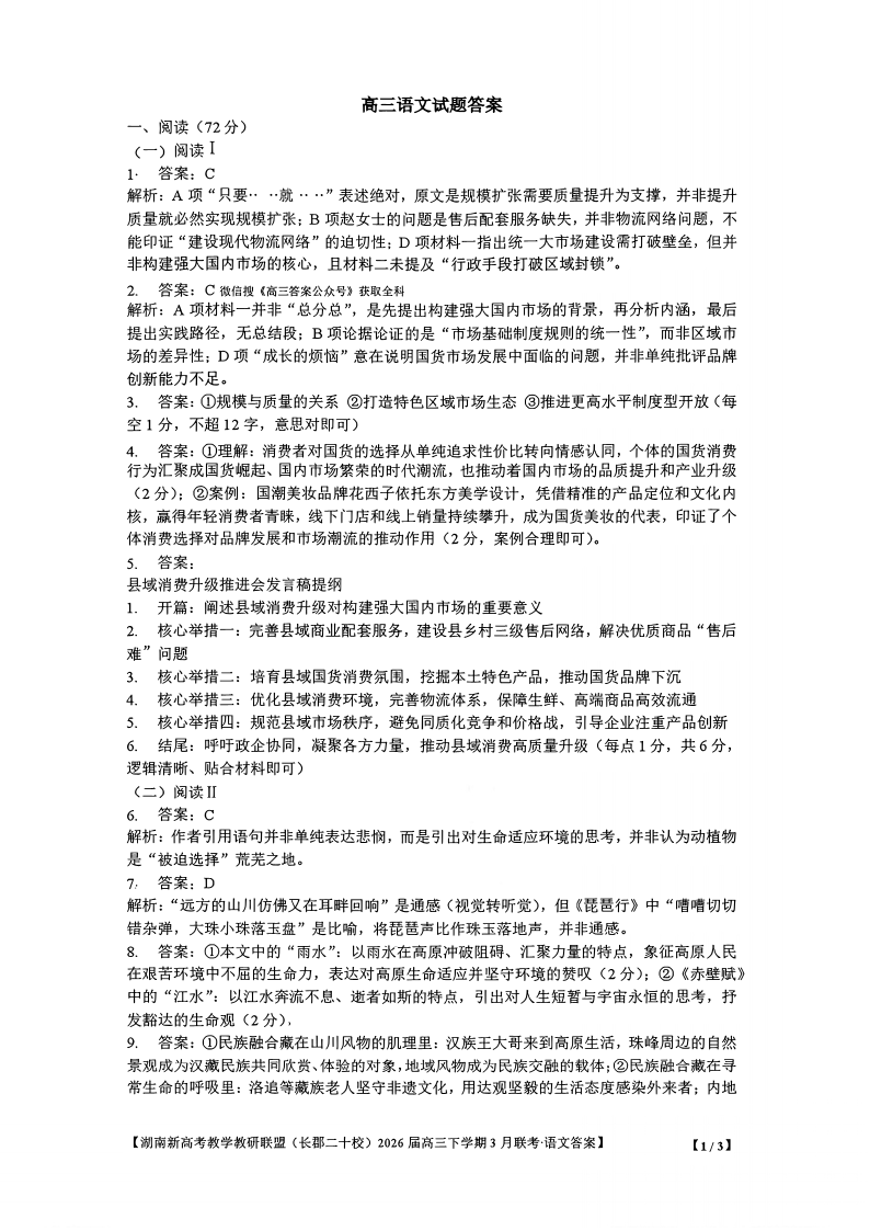 高三语文答案--湖南省新高考教学教研联盟(长郡二十校联盟)2026届高三下学期3月联考