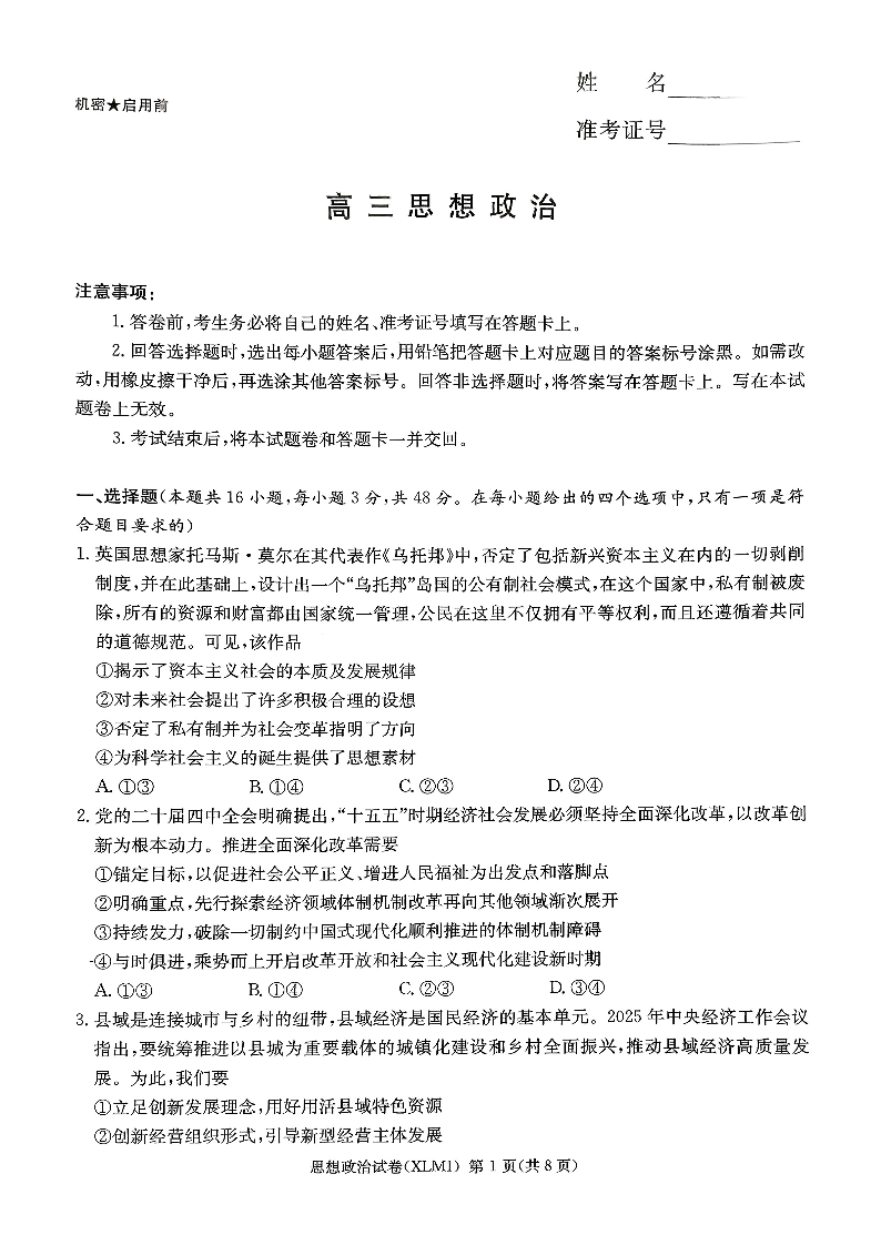 高三政治--湖南省新高考教学教研联盟(长郡二十校联盟)2026届高三下学期3月联考