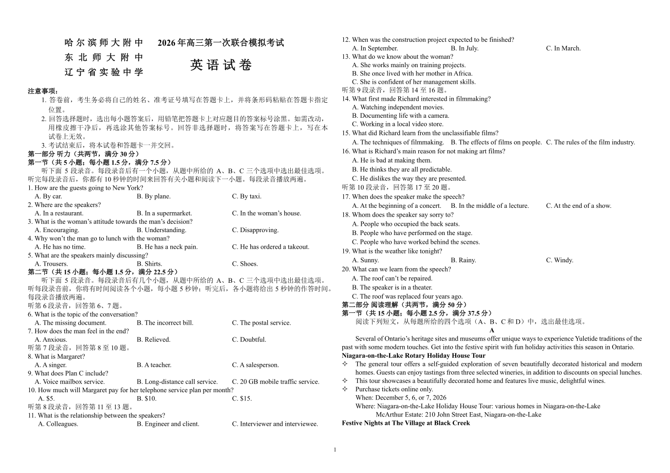 高三英语--东北三省三校(辽宁实验中学、东北师大附中、哈师大附中)2026届高三下学期第一次联合模拟考