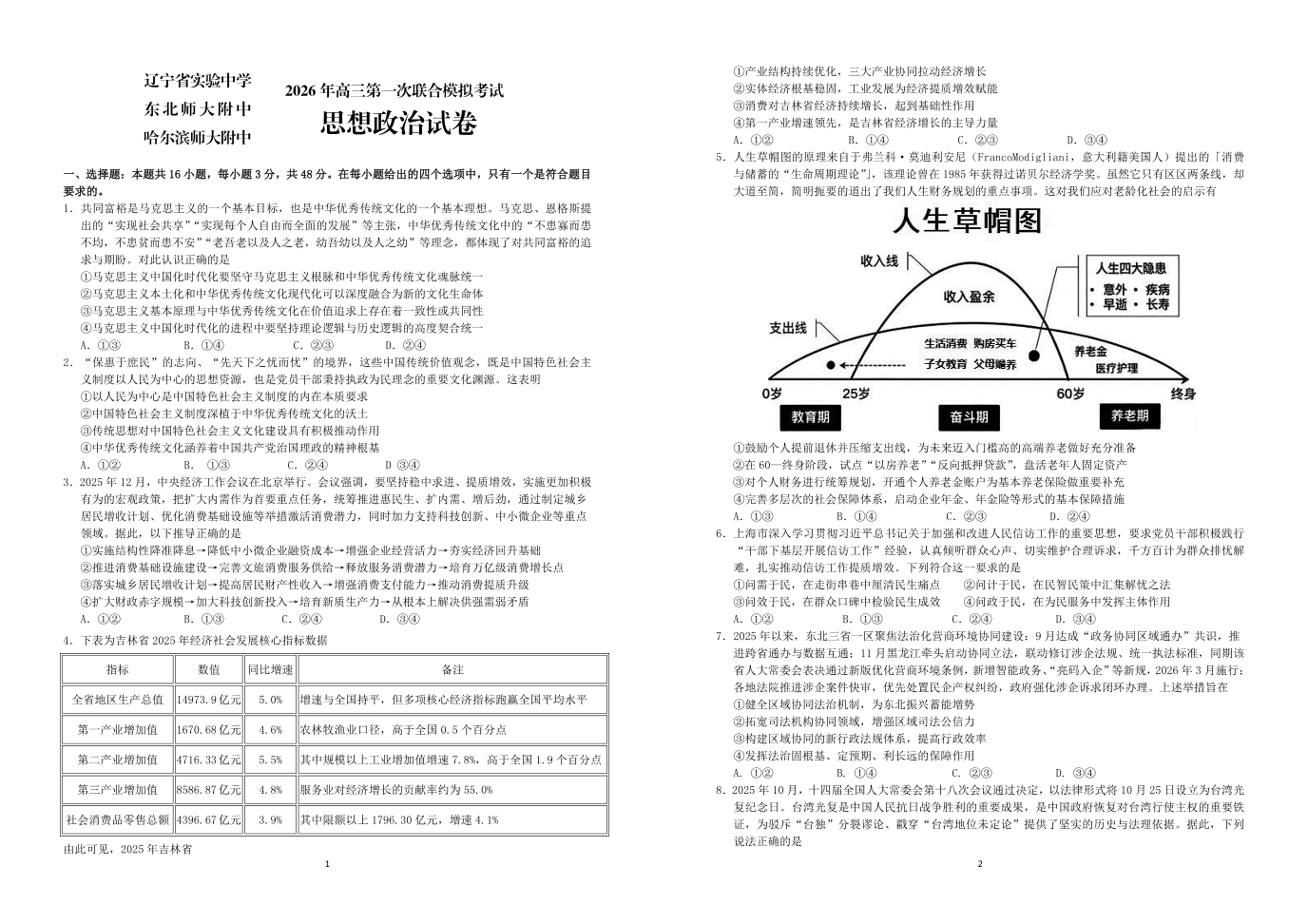高三政治--东北三省三校(辽宁实验中学、东北师大附中、哈师大附中)2026届高三下学期第一次联合模拟考