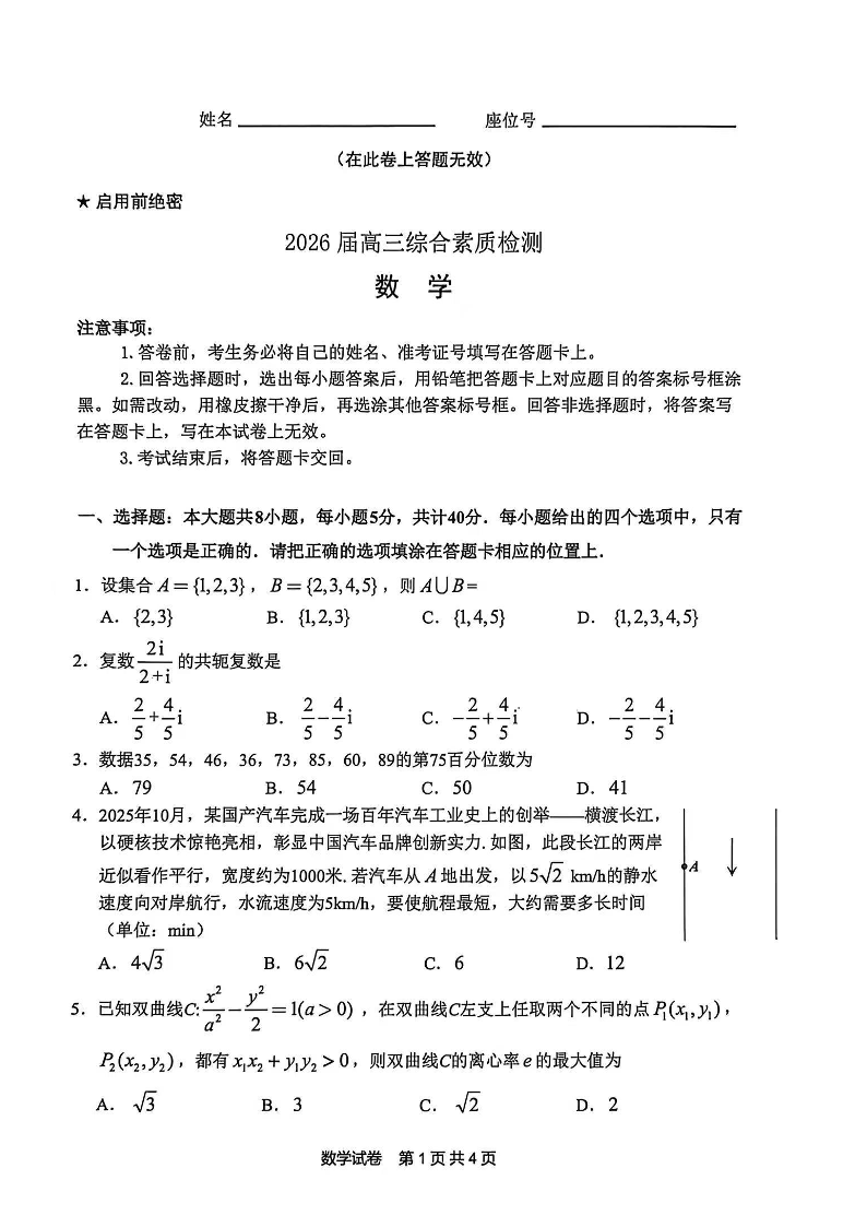 高三数学--安徽省江南十校2026届高三下学期3月开学考试