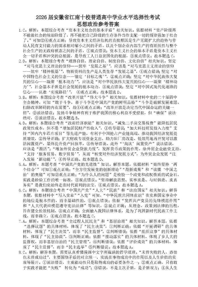 高三政治答案--安徽省江南十校2026届高三下学期3月开学考试