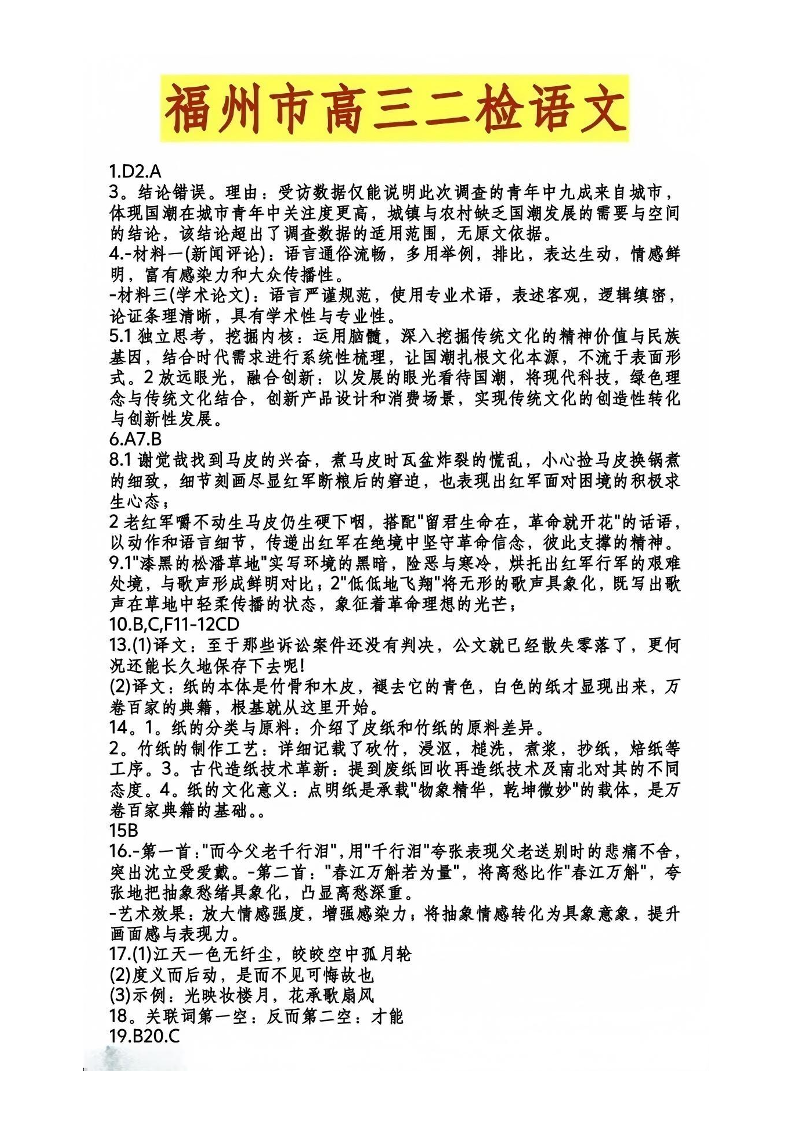 高三语文答案--福建省福州市2026届高三三月质量检测