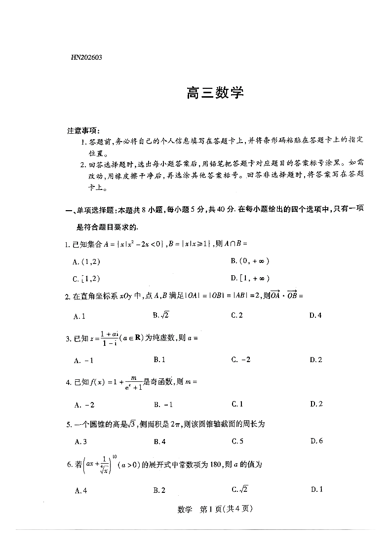 高三数学--河南省部分高中2026届高三下学期3月开学素质评价考试