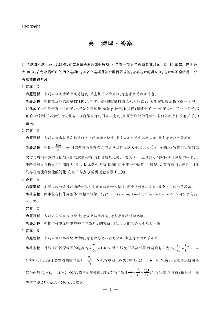 高三物理答案--河南省部分高中2026届高三下学期3月开学素质评价考试