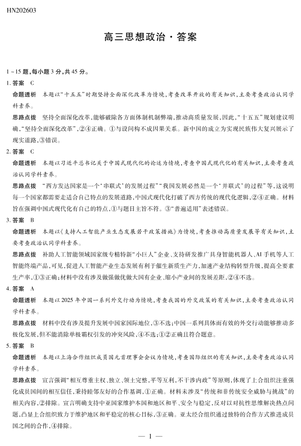 高三政治答案--河南省部分高中2026届高三下学期3月开学素质评价考试