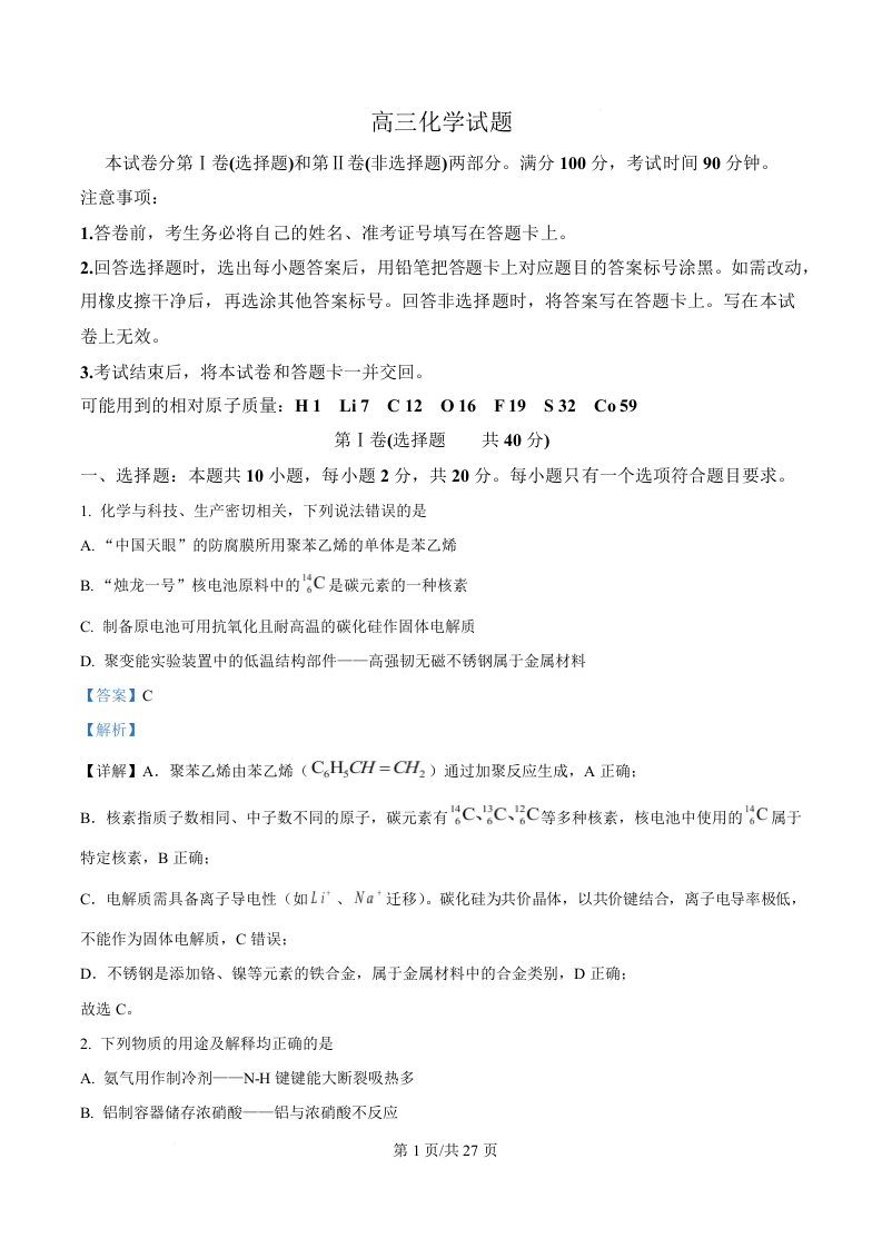 高三化学(解析版)--山东德州市2026届高三下学期3月一模考试(德州一模)