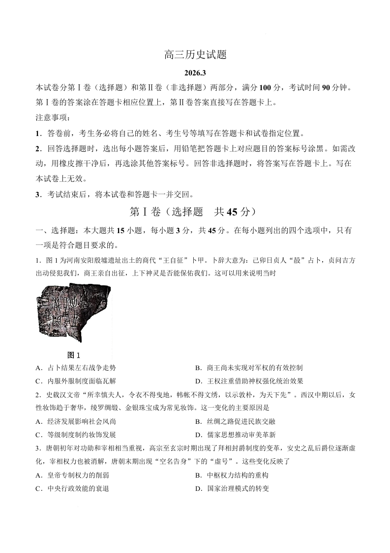 高三历史--山东德州市2026届高三下学期3月一模考试(德州一模)