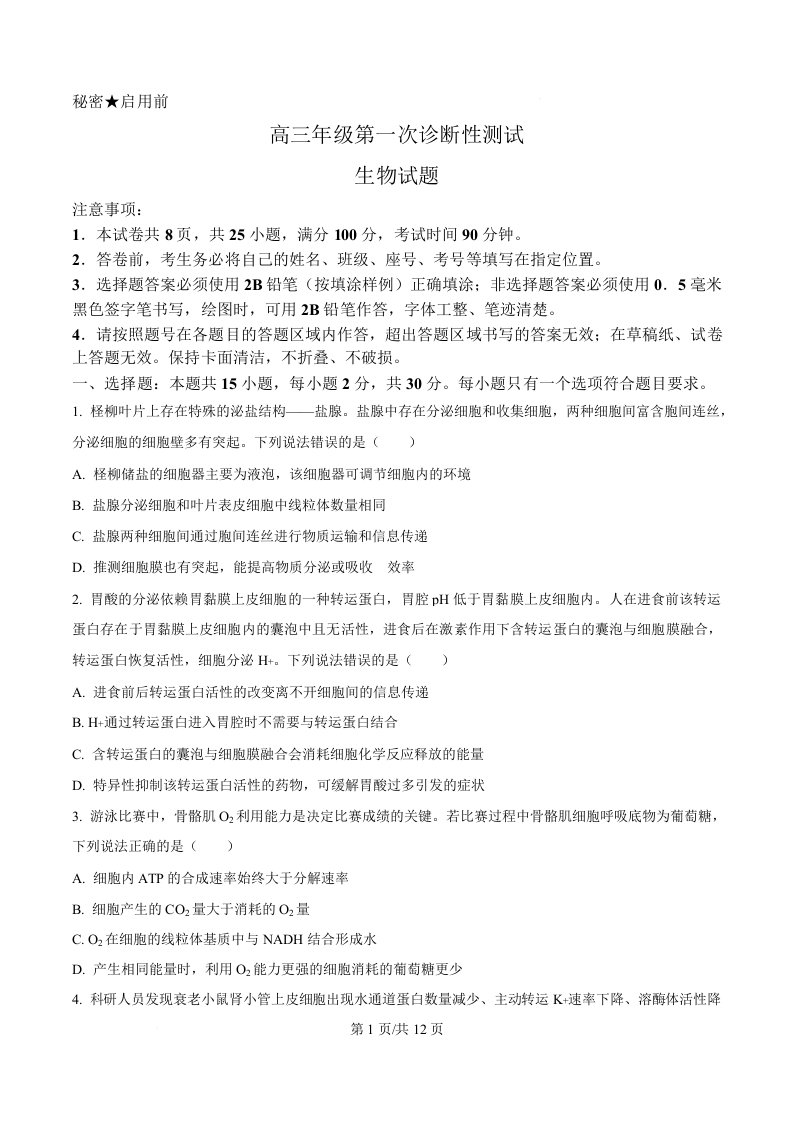 高三生物(原卷版)--山东东营市2026届高三下学期第一次诊断性考试(东营一模)