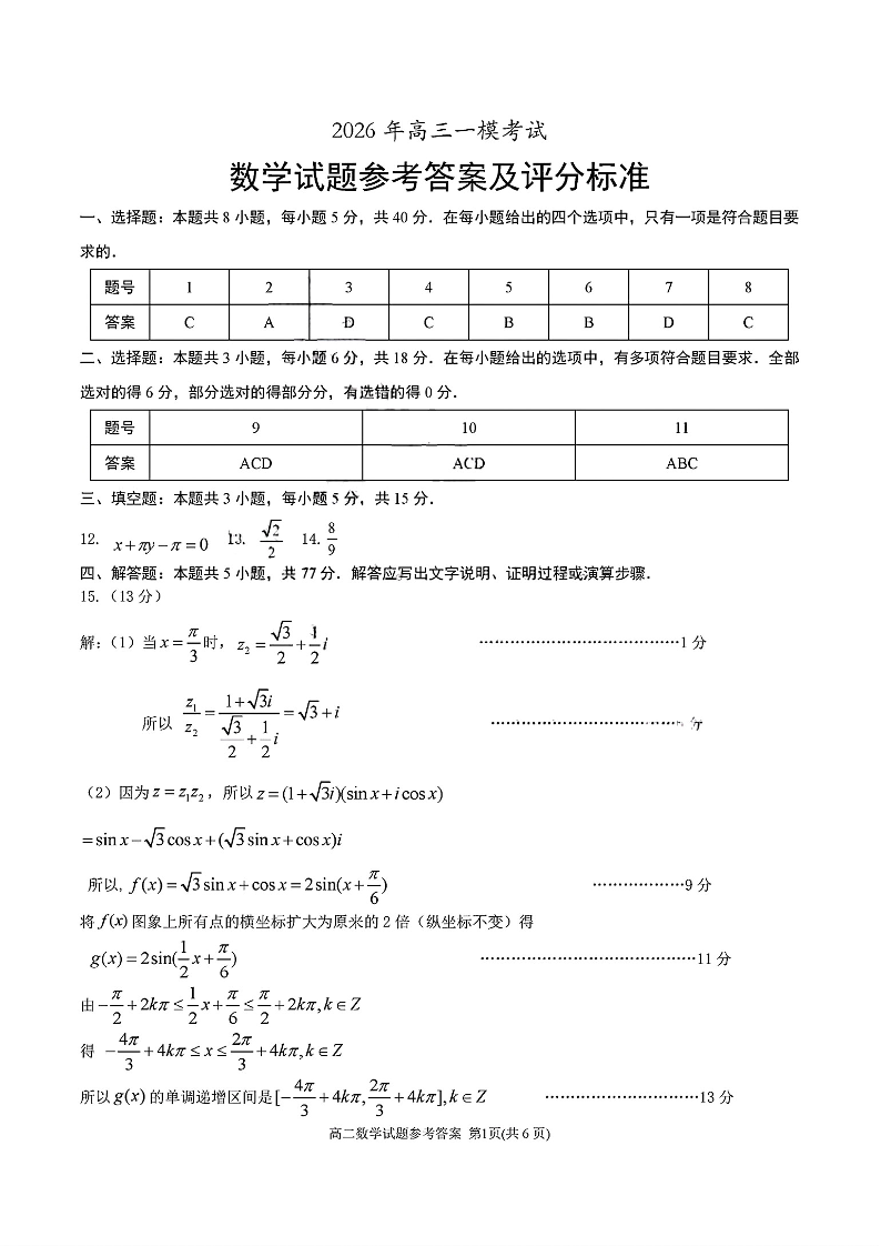 高三数学答案--山东菏泽市2026届高三下学期3月一模考试