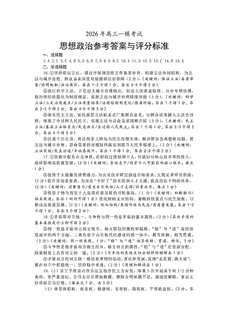 高三政治答案--山东菏泽市2026届高三下学期3月一模考试