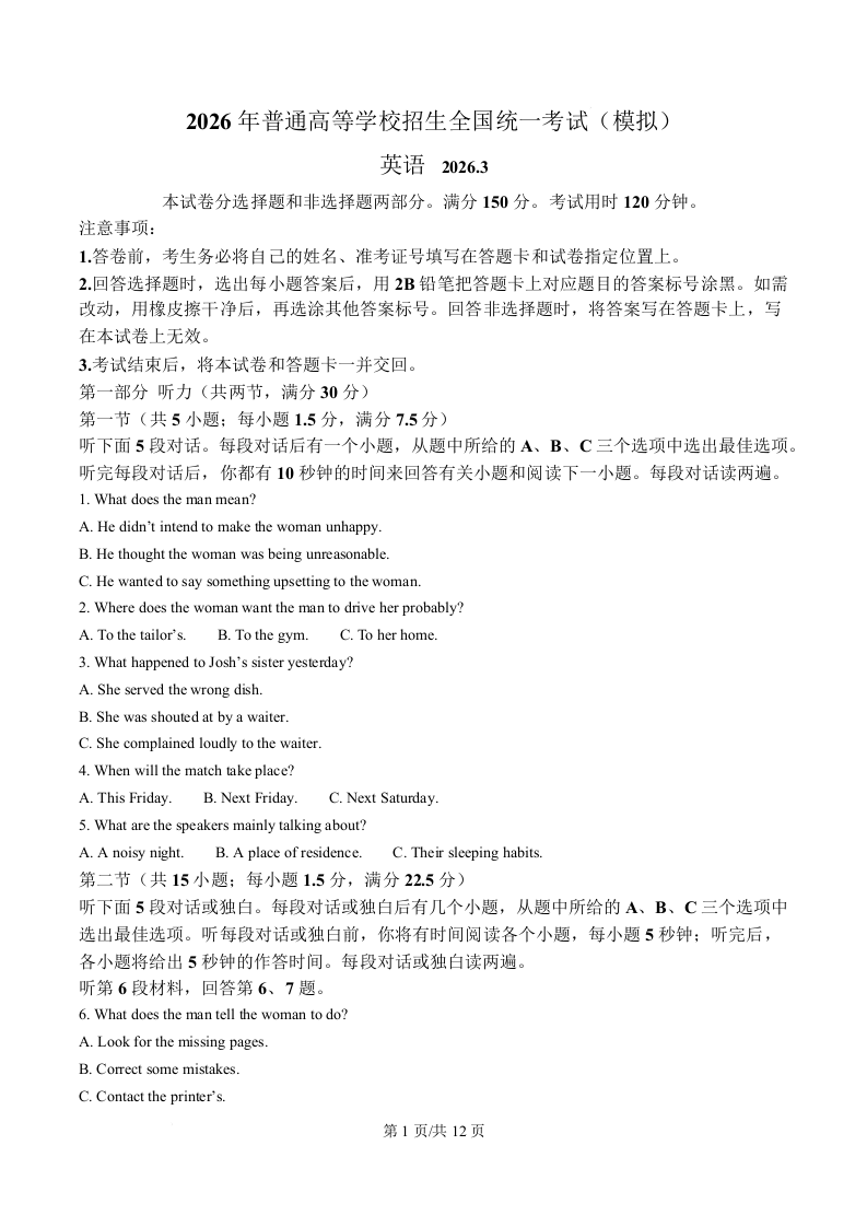 高三英语(原卷版)--山东临沂市2026届高三下学期3月一模考试