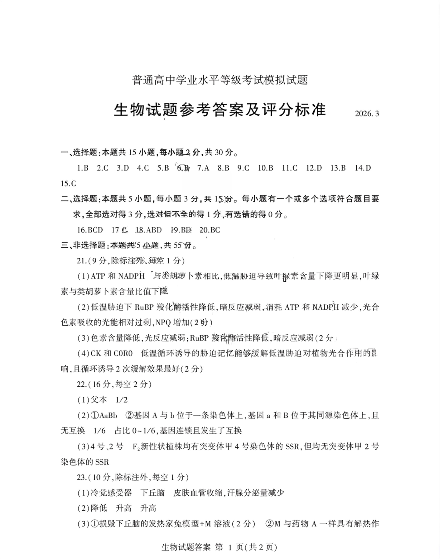 高三生物答案--山东临沂市2026届高三下学期3月一模考试