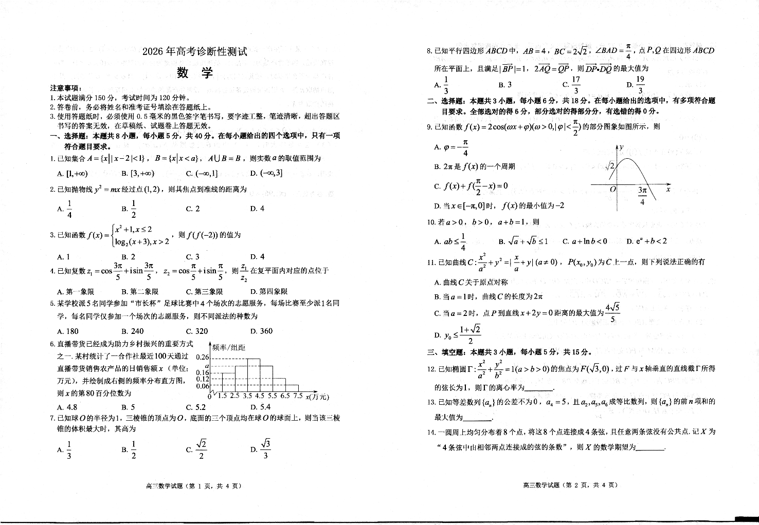 高三数学--山东烟台市2026届高三下学期诊断性考试(烟台一模)