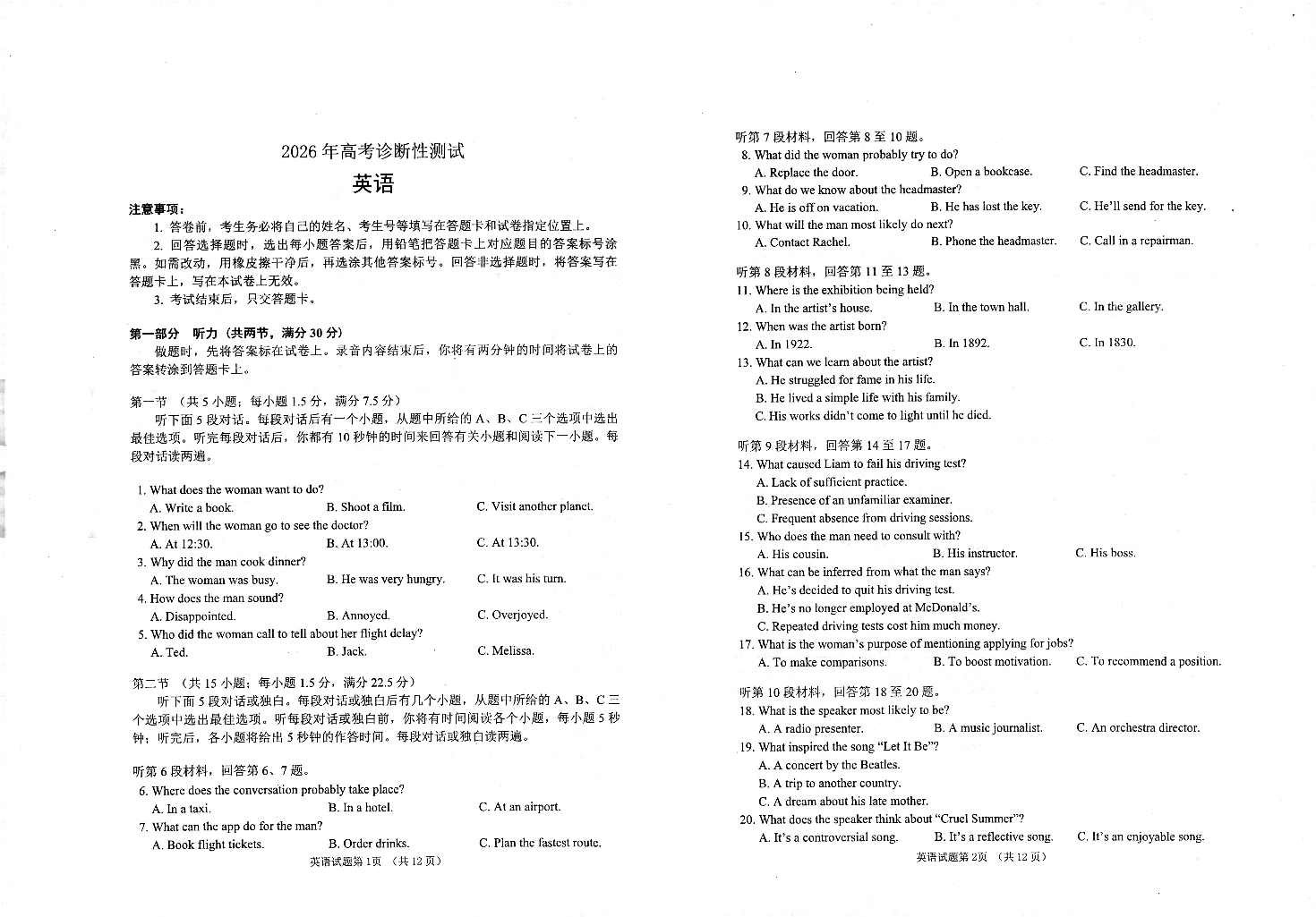 高三英语--山东烟台市2026届高三下学期诊断性考试(烟台一模)