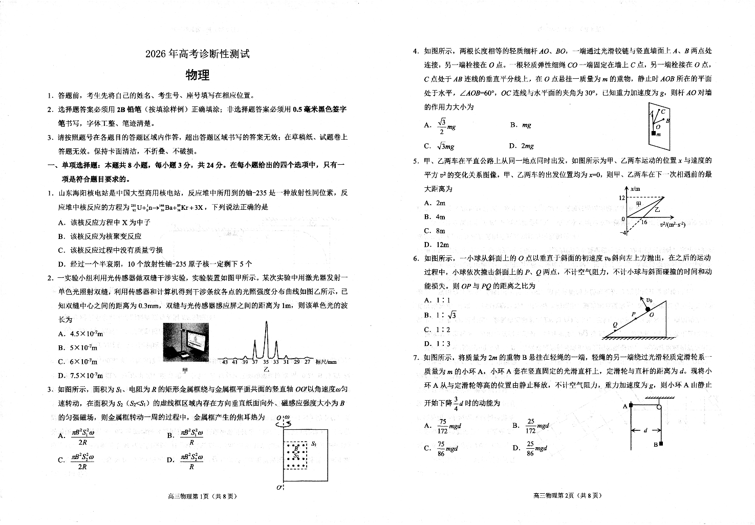 高三物理--山东烟台市2026届高三下学期诊断性考试(烟台一模)