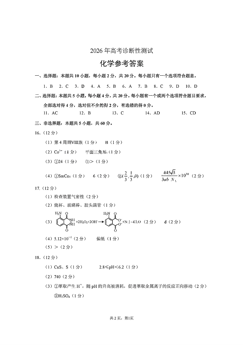 高三化学答案--山东烟台市2026届高三下学期诊断性考试(烟台一模)