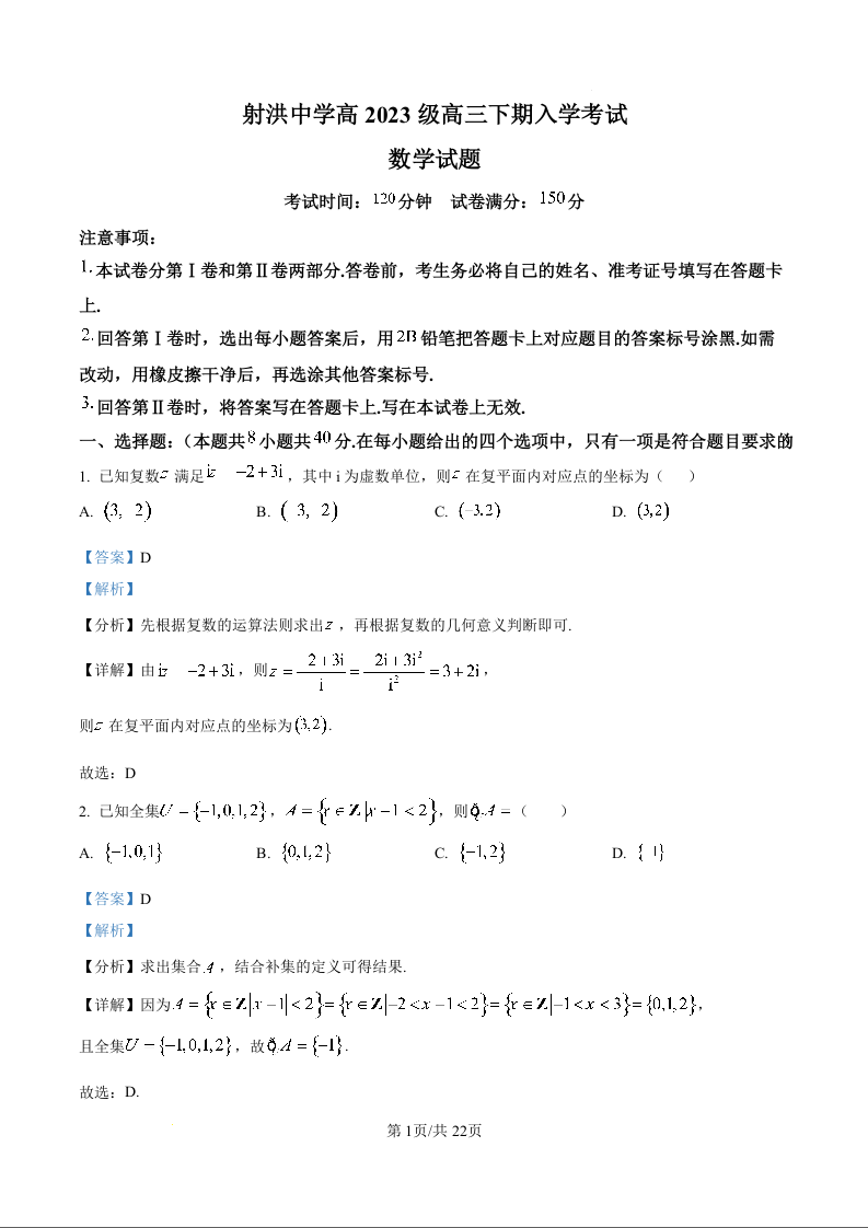 高三数学(解析版)--四川省射洪中学校2026届高三下学期3月入学考试