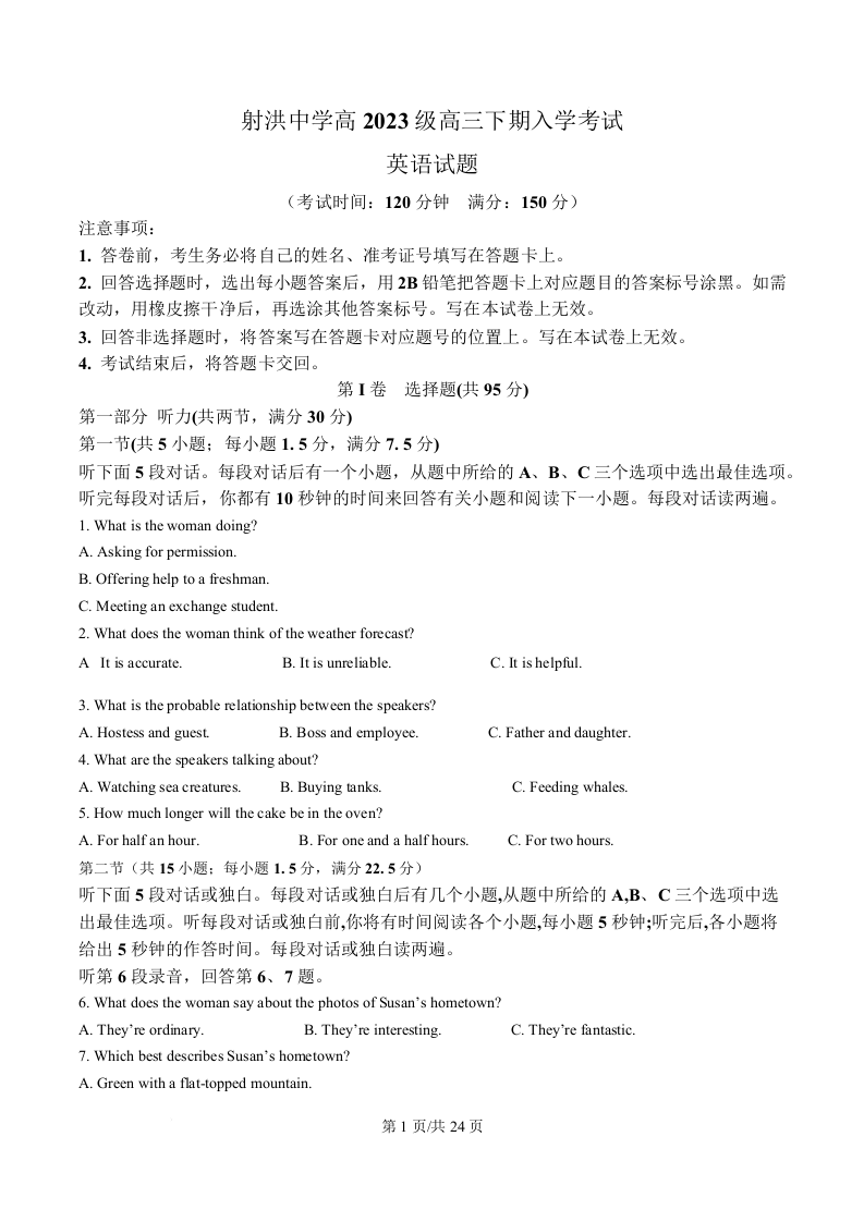 高三英语(解析版)--四川省射洪中学校2026届高三下学期3月入学考试