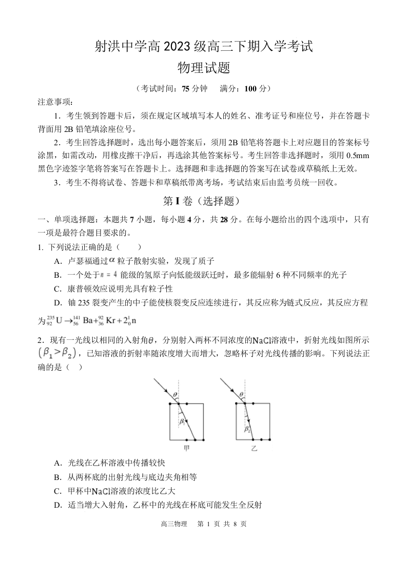 高三物理--四川省射洪中学校2026届高三下学期3月入学考试