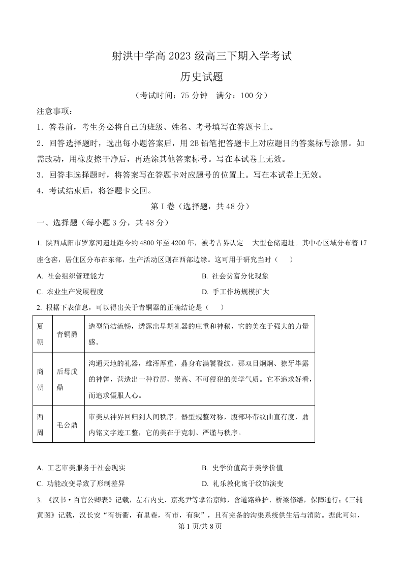 高三历史(原卷版)--四川省射洪中学校2026届高三下学期3月入学考试