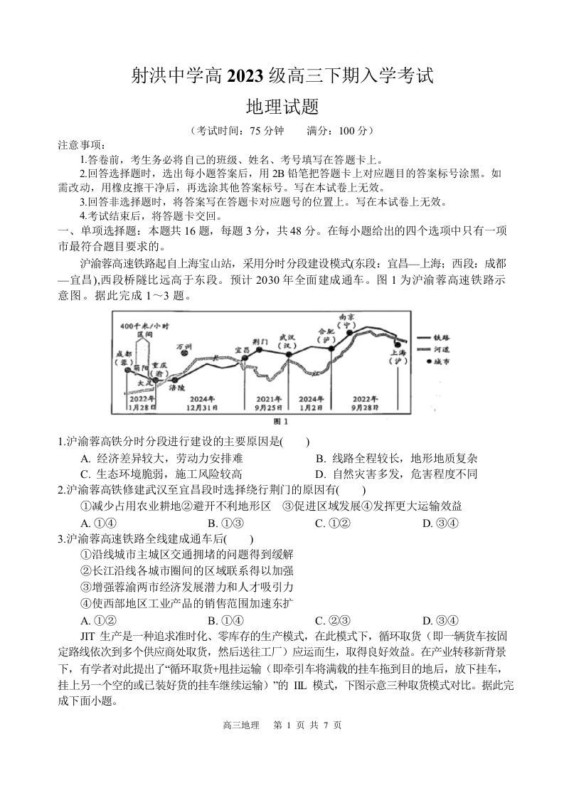 高三地理--四川省射洪中学校2026届高三下学期3月入学考试