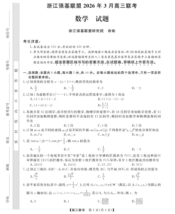 高三数学--浙江强基联盟2026届高三下学期3月联考(二模)