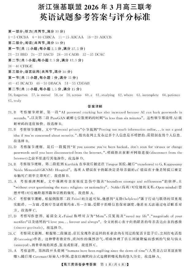 高三英语答案--浙江强基联盟2026届高三下学期3月联考(二模)