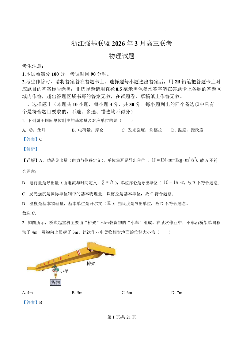 高三物理(解析版)--浙江强基联盟2026届高三下学期3月联考(二模)